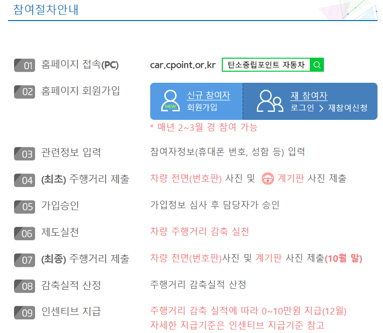 신청은 선착순으로 진행되므로 당일에 빠르게 신청하는 것이 좋습니다. 신청자는 반드시 자동차 소유자여야 하며, 작년보다 주행 거리가 적어야 합니다. 주행 거리에 따라 최소 2만 원에서 최대 10만 원까지 인센티브를 받을 수 있으며, 작년보다 더 많이 주행한 경우에는 인센티브가 지급되지 않습니다.