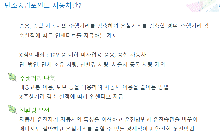 탄소중립 포인트 자동차 제도는 매년 신청할 수 있는 프로그램입니다. 이 제도는 전국에서 시행되지만, 서울시는 제외됩니다. 따라서 서울에 거주하지 않는 분들은 일정에 맞춰 꼭 신청하세요!
